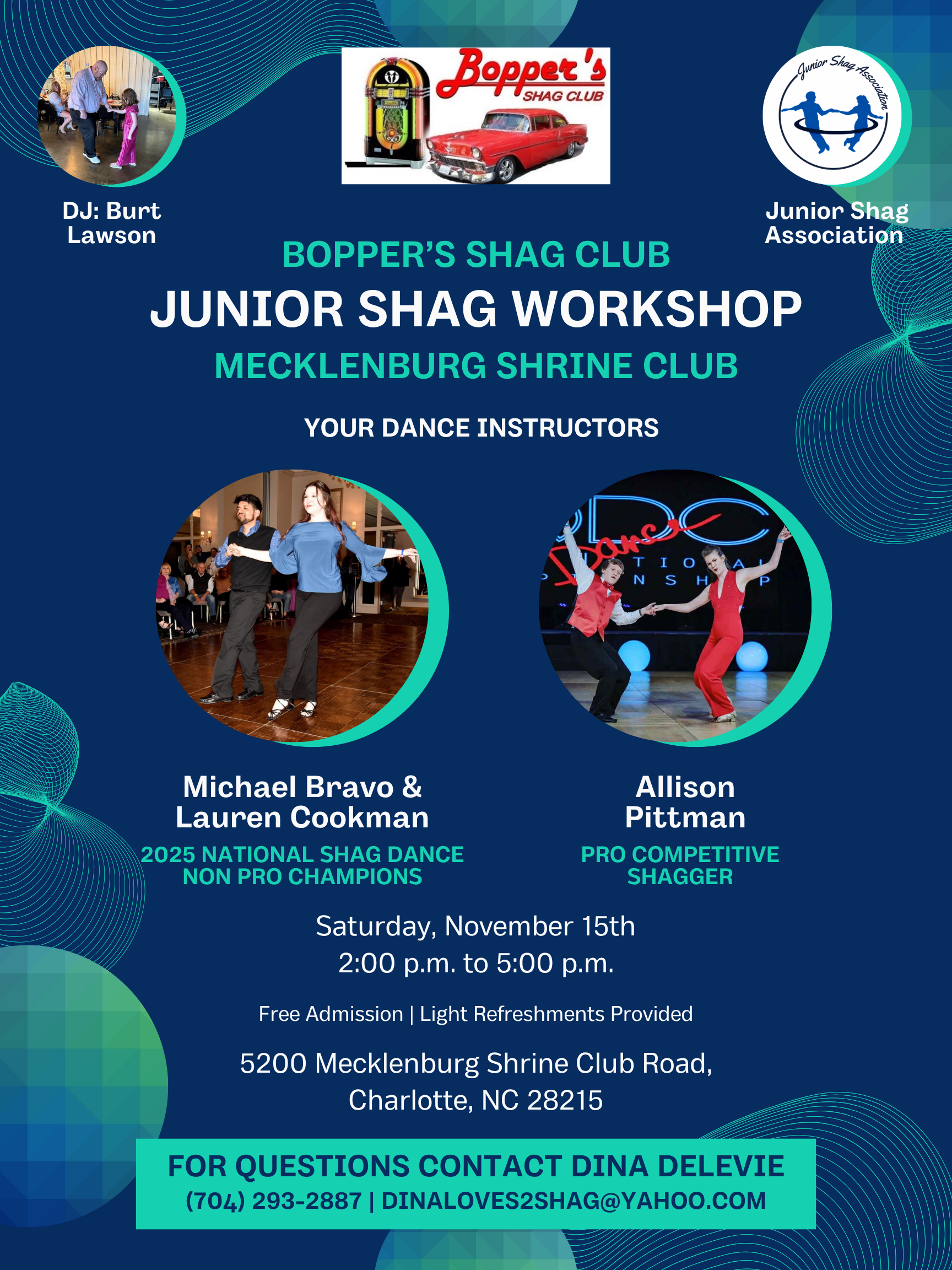 Bopper's Shag Club will be hosting a free Junior Shag Workshop with Pro Shaggers Cody & Jessica (McAlhany) Edwards and Competitive Shaggers Lauren Cookman & Michael Bravo from 11am - 2pm. Featuring DJ Randy Lomax with Pizza, Soft Drinks and Water provided.